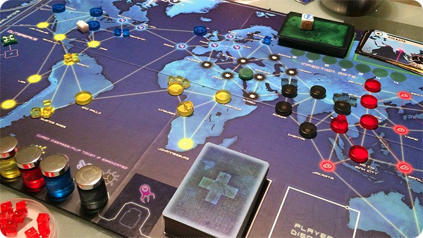 В Пандемии. State of Emergency мы поставили рекорд. Кажется, сыграли всего ходов пять, и проиграли почти по двум показателям сразу. Сначала чуть не закончились жёлтые кубики болезни (мне уже показалось, что всё, но тут нашёлся 1 кубик, оставшийся в игре). Потом произошло сразу несколько вспышек эпидемии у «мартышек», и игра закончилась поражением т.к. жетон эпидемий дошёл до черепка с костями.