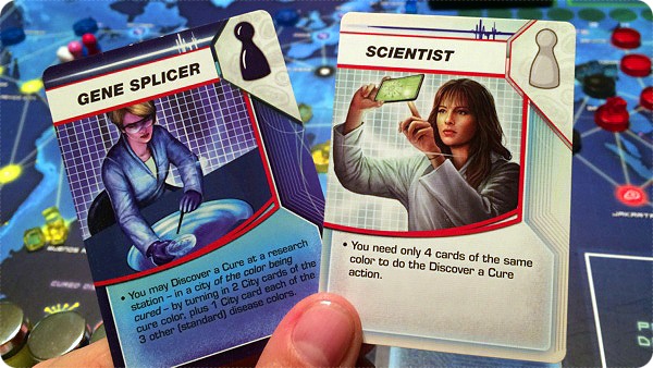 Мне, кстати, в начале на выбор выпало две роли, и обе позволяют создавать вакцины в упрощённом порядке. Ну, учёный-то, которому просто вместо 5 карт надо набрать 4, мне хорошо знаком, ничего нового. А вот генетик – заинтересовал. Ему (точнее, ей), чтобы изобрести лекарство надо придти в город цвета будущей вакцины и сыграть набор из 5 карт: 2 карты цвета этого города и ещё 3 карты других трёх цветов. Звучит заманчиво. Жаль, только, нам это никак не помогло.