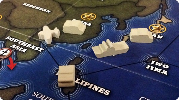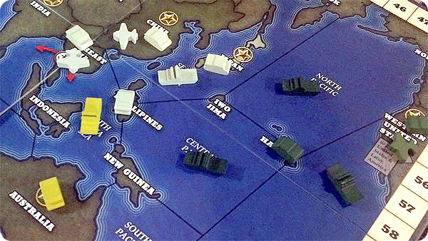 В целом же на поле разворачивалась уже традиционная для наших партий картина. Стремительное наступление Германии, уничтожение СССР, наступление Союзников на Западную Европу. Немцам в этот раз очень повезло, помимо стартового блицкрига (мы играем с правилом «Подготовка к войне», когда каждый игрок перед началом партии разыгрывает 1 карту статуса или секрета) пришли и остальные их мощные карты, так что СССР был обречён. Тем более, что Великобритания изначально подалась в Австралию. Позднее Советский Союз смог отстроиться и продолжил существование в Китае, но и оттуда его выбили.