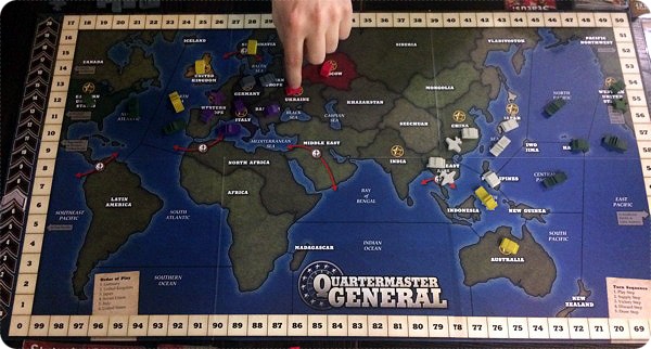 В Quartermaster General впервые сыграли с дополнением Air Marshal. Себе я выбрал Японию, хотелось посмотреть, сильно ли меняется позиция страны с новыми картами, изменят ли расклад самолёты. Сразу говорю – на первый взгляд принципиально ничего не изменилось. Всю партию я шёл по консервативному пути: захват Китая, статус с очками за острова и Юго-Восточную Азию. С этих локаций и собирал примерно по 5 очков в ход. Иногда брал чуть больше, когда удавалось взять Индию или разыграть бомбардировку, иногда, когда выбивали из Китая, чуть меньше.