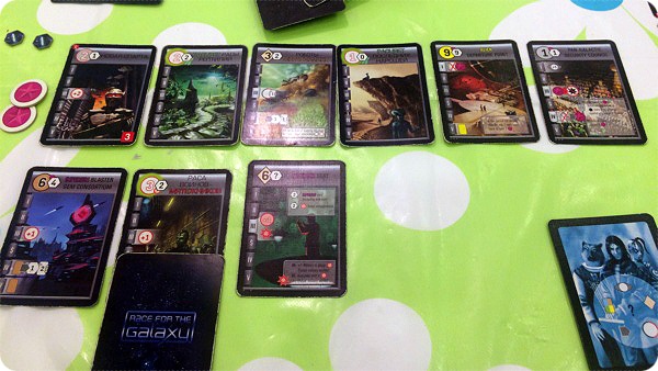 Race for the Galaxy разложили на четверых. Пробовал сыграть на комбинации военной мощи и «империумной» «шестёрки», приносящей очки за миры мятежников и карты с фиолетовым словом «империя». Только как назло толком ни войны, ни мятежников в руку не приходило. Пришлось обходиться случайными «империумными» картами, плюс удалось разыграть на стол две «девятки»: жёлтый иноплатеный мир и «империумное» военное улучшение. Кажется, в итоге я занял второе место, но лидер оторвался чуть ли не вдвое: там была какая-то производственно-