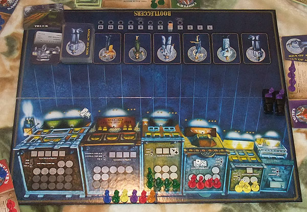 На неделе мы также сыграли в Бутлегеров — первый раз на столе появился мой экземпляр игры, приобретённый в прошлом году за $15. Играли полным составом, вшестером. Некоторые игроки раньше этой настолки не видели, но быстро усвоили правила, благо в Botleggers ничего сложного нет, игровой процесс интуитивно понятен: производим водку, грузим её в автомобили и везём в бары. Плюс кто "держит" бар, тот и собирает с него дополнительный доход.