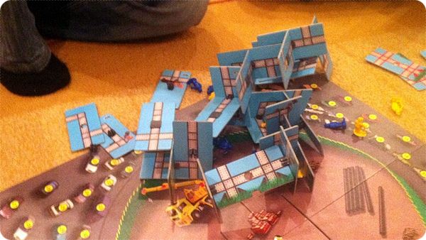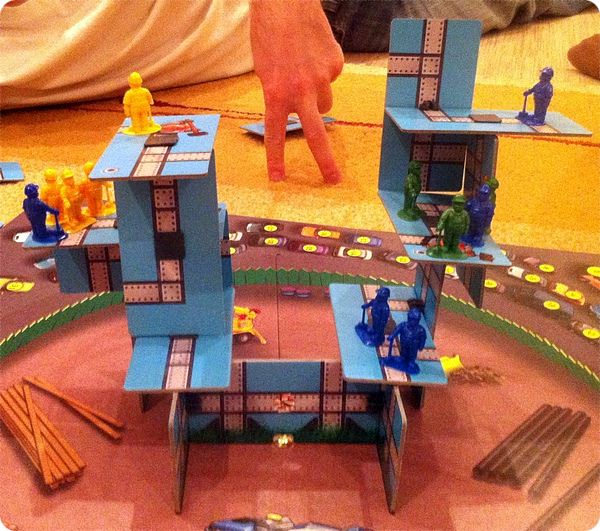 На столе у нас начал рости не один небоскрёб, а целых два. Обе башни были оккупированы рабочими, каждый старался поднять своих работников повыше. Причём, я старался ставить своих людей специально поближе к краю платформ в надежде, что кто-нибудь их скинет. За это по правилам полагается -5 очков, а "погибший" рабочий возвращается на башню, причём его можно поставить в любое место, даже выше, чем он был (это если уронил чужого, своего возвращаешь туда, откуда он упал). Рабочие, кстати, начали быстро сыпаться. Но мы решили сделать скидку на первую партию и никого не минусовали.