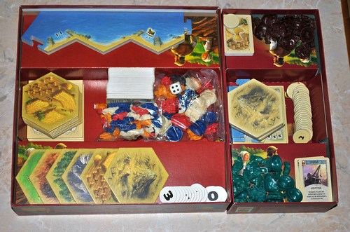 В-четвертых очень сильно сэкономили на внутренностях (иннерах) коробок — красная картонка ступенечкой и у дополнения, и у новой базовой игры. А в предыдущих версиях базы был более-менее удобный пластиковый иннер. Мизерная надежда на подставку-разделитель для ресурсов умерла окончательно…