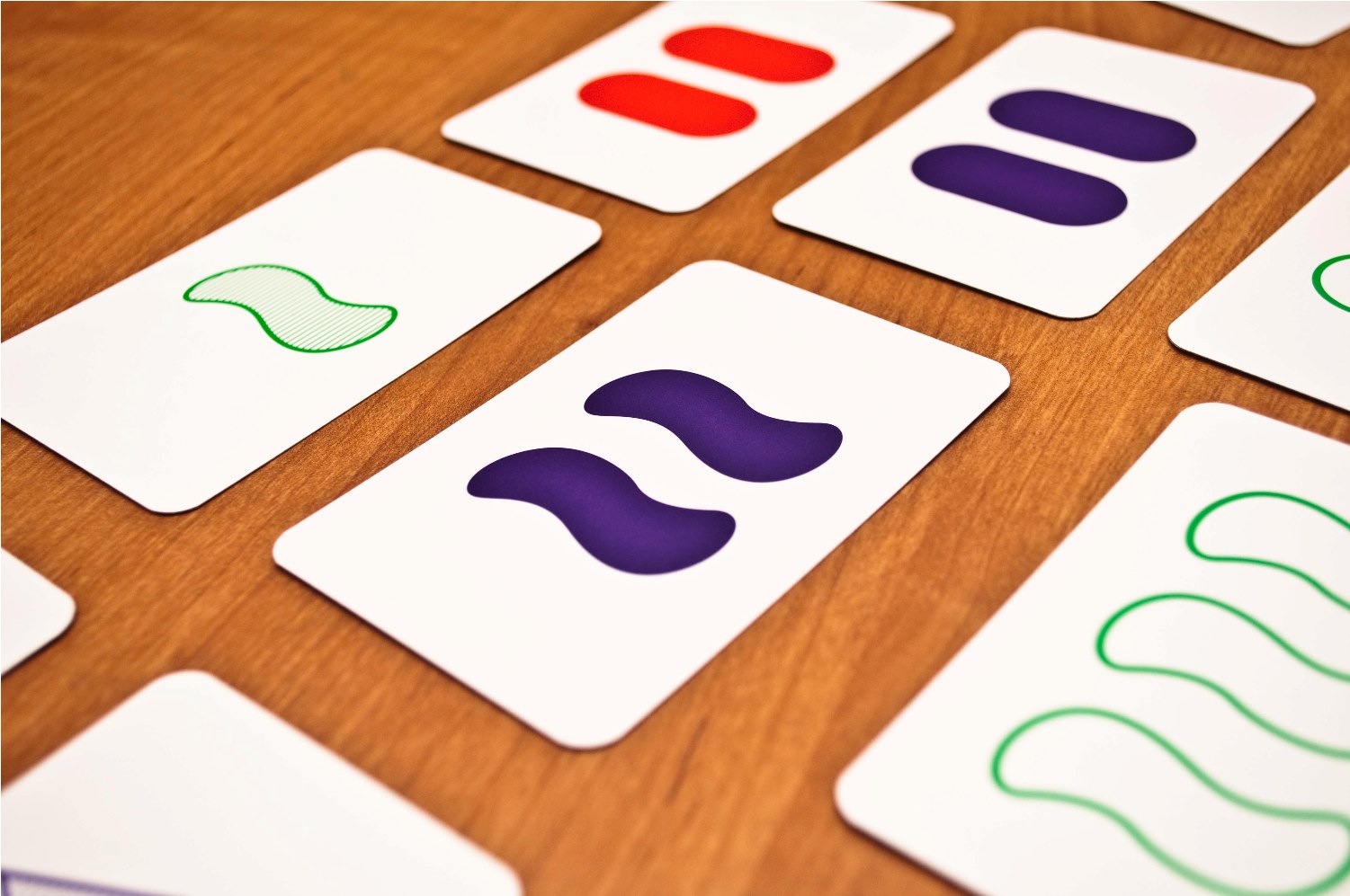 Правила такие: на стол выкладывается 12 карт с некоторыми похожими, но разными изображениями. У изображений есть четыре признака – цвет, количество, форма и наполненность элементов. Задача играющих – найти среди этих карт такие три, которые по всем четырём признакам либо одинаковы, либо разные.