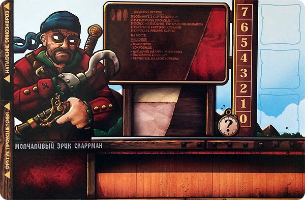 Кстати, именно из-за этого текста в первых партиях стоит ожидать ощутимых пауз между ходами даже при четырёх игроках, не говоря уже о случаях, когда за игрой собирается максимальный состав из шести человек. Да и, вообще, так называемый даунтайм, заметные промежутки времени между ходами одного и того же игрока здесь присутствует. Пираты, ведь, строятся по классическому варианту, когда каждый игрок целиком последовательно отыгрывает несколько фаз хода, затем ход передаётся к следующему, и так далее. Ход одного игрока занимает хоть и не значительное, но заметное время и, хотя, теоретически, ты можешь и должен интересоваться тем, что делают соперники (они могут на тебя что-нибудь сыграть, да и нападать правилами позволяется), во время чужих ходов заняться по большому счёту нечем. Просто сидишь и ждёшь.
