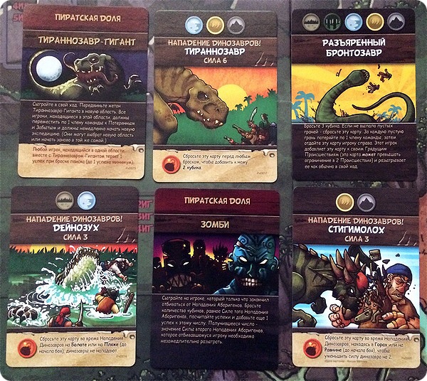 Игровые карты бывают двух типов: положительные и отрицательные. Положительные, понятное дело, играются на себя, отрицательные — на противников. В свой ход можно подложить по 1 карте каждому оппоненту, после чего те будут вынуждены разбираться с неожиданными трудностями. Карты как правило либо заставляют игрока вступить в бой с кем-нибудь из обитателей острова, либо пострадать от его неблагоприятной среды. И в том и в другом случае есть риск потерять часть экипажа.