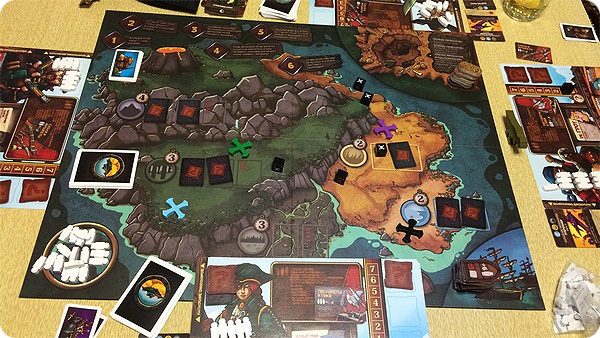Вкратце типичный ход игрока выглядит так: берём 2 карты, затем смотрим что против нас сыграно, кидаем кубики, теряем или не теряем экипаж, кидаем кубики за поиск сокровищ, двигаем фишку по треку затраченного на поиски времени (если достигаем нуля, смотрим ориентир после чего идём искать сокровища снова), подкидываем товарищам какие-нибудь пакости и передаём ход следующему игроку.