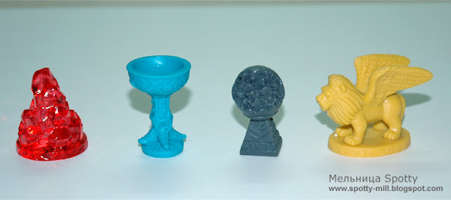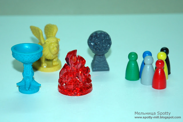 Помимо фигурок артефактов, есть и фишки персонажей. Фишки достаточно простые, что даже несколько странно при столь богато оформленных остальных компонентах, но это отнюдь не мешает самой игре. В немецком издании вместо фишек есть фигурки, которые выглядят несколько странно. Так что лучше простые фишки.
