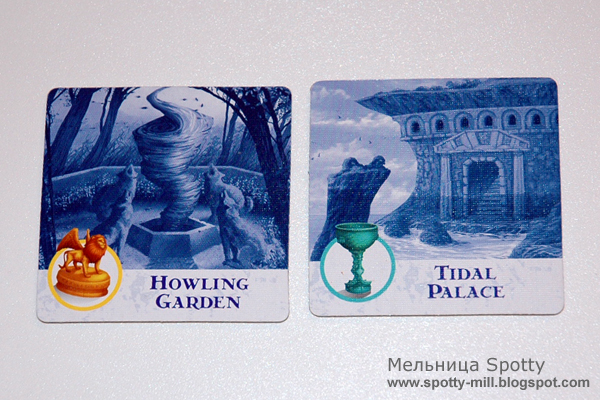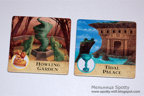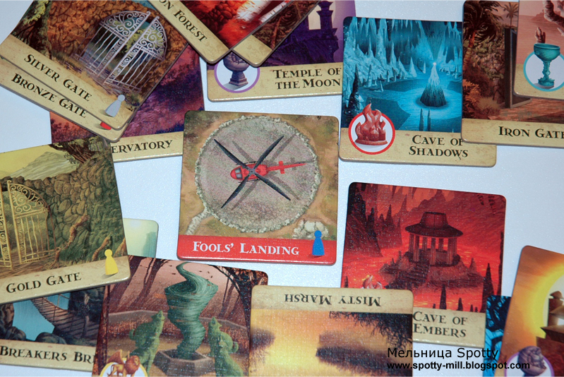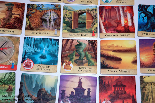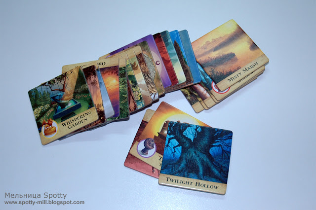 Изображения показывают леса, сады, мосты, пещеры и прочие локации острова, где вам придется побывать, бегая взад-вперед в поисках артефакта. Иллюстрации отличные, очень красивые, а некоторые хотелось бы распечатать в большем размере и повесить куда-то на стенку. Сами тайлы сделаны с текстурой лен, поэтому на некоторых фотках дали блик на своей рельефной поверхности и выглядят немного потертыми. Это не так, в жизни все выглядит великолепно.
