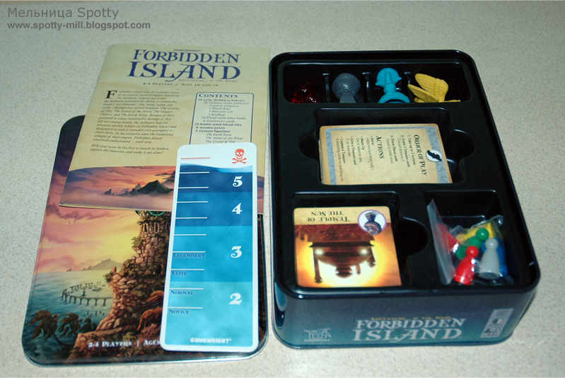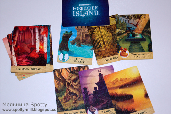 На сайте Мельница Spotty опубликован подробнейший обзор компонентов игры Forbidden Island. В нём приводится множество фотографий, а в качестве бонуса содержатся новые варианты раскладки острова для усложнения игры и ссылка на сайт художника, который занимался её оформление.