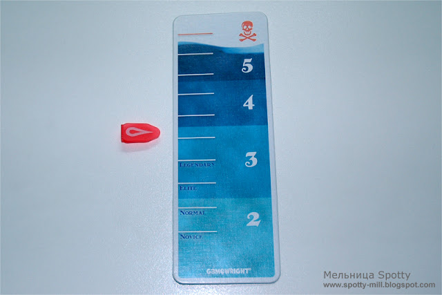 Так как остров уходит под воду, то нужно измерять уровень воды. Для этого у нас есть некий инструмент. Шкала уровня воды представляет собой картонную полоску с метками уровней, по которой должен перемещаться пластиковый бегунок, который крепиться в виде прищепки на шкалу. Бегунок интересной формы, как бы с «хвостиком», который сделан, чтобы его было удобнее двигать вверх/вниз. Я попробовал и решил, что бегунок уж очень крепко цепляется и через время однозначно протрет краску и испортит шкалу. Поэтому во время игры я бегунок кладу сверху (на шкалу) и не испытываю от этого никаких неудобств.