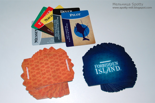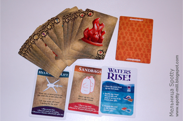 2. Карты из «колоды затопления» скидываются в «стопку зброса» до тех пор, пока участок острова не «канул в пучину». После, соответсвующую карту можно изъять вообще из игры. Стопка сброса «карт затопления» постоянно уменьшается, в конце игры может вообще остаться один участок острова «круг авантюристов». :)))