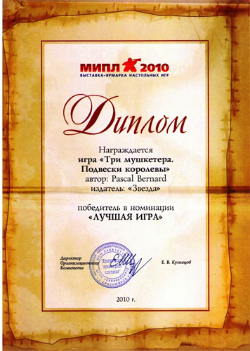Недавно я узнал, что свои премии были изготовлены и организаторами прошлогодней игровой выставки Мипл — 2010. Сколько таких премий было изготовлено мне неизвестно, но как минимум одна точно существует — её недавно вручили представителям компании Звезда (см. фото сверху). Вместе с премией Звезда получила также и диплом за игру Три мушкетёра. Подвески королевы.