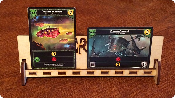 Ещё один неведомый для меня предмет: подставки под карты. Идея в том, что такая конструкция размещается на столе, в неё помещаются колоды карт, и далее в ходе игры ты берёшь карты не просто из колоды на столе, а из колоды вот на такой "полочке".