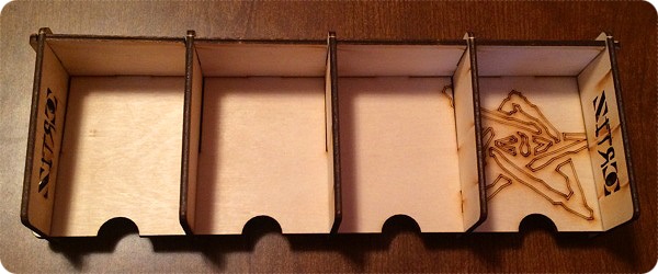 Выглядит любопытно, будем пробовать как оно в деле. Эту вот, четырёх секционную штуку я планирую приспособить под Поселенцев в дуэльном режиме: слева колода одного игрока, справа – другого, в середине общая колода и общий отбой. Если понравится, может даже залакирую!