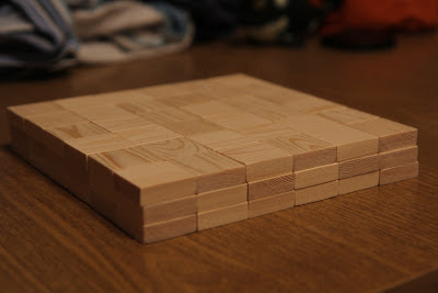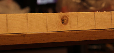 Сначала нужно разметить рейку на фишки.Так как ширина рейки 3 сантиметра, фишки мы будем делать размером 3х3 см. Для этого берем угольник и остро заточенный карандаш и наносим разметку. Границы между фишками нужно делать с учетом толщины пилки лобзика (измеряется штангенциркулем), нанося двойную разметку. Такой подход позволяет повысить точность, так как пилить нужно между двух линий, а не по одной. При разметке сразу выкидывайте области с сучками, так как нам не нужны "меченные" фишки.