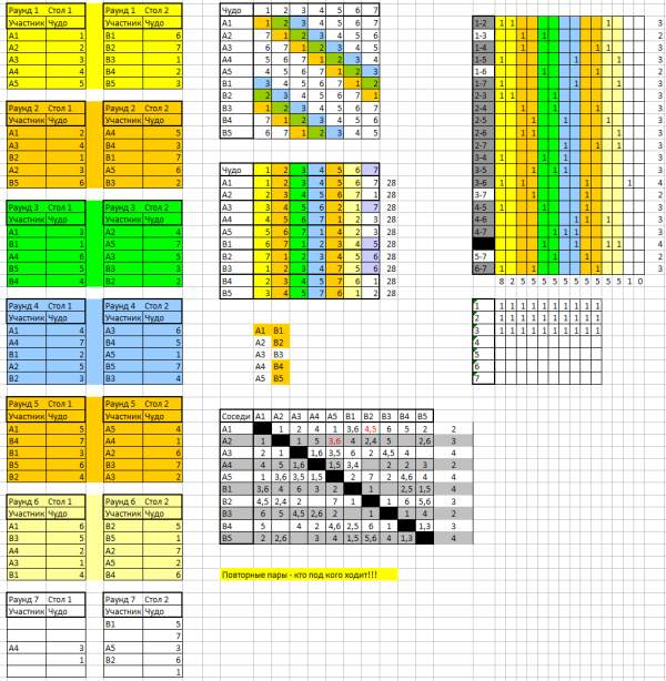 Результаты пока что отрицательные. В седьмой партии концы с концами не сходятся. Некоторые игроки вообще не встречаются друг с другом (например, A2 и B4), а некоторые сыграют кучу партий повторно (напримре, А1 встретится с одними и теми же игроками только дважды, а А5 — четырежды).