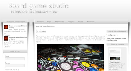Недавно в сети появился сайт, призванный объединить российских авторов настольных игр. Проект, расположившийся по адресу www.boardgamestudio.com, называется Board Game Studio и создан Юрием Журавлёвым (Звёздные системы, Великий Алхимик, Кост Рануа, Эльфийские письмена) и Евгением Прокопцовым (Distant Galaxy и Combat of Slaves).