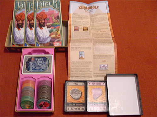 И вот сейчас я хочу рассказать о двух играх, которые, несмотря на общую похожесть и компактность, я все равно оставил у себя в коллекции. Одна из них – «Археология» (далее – «А») от австралийца Фила Хардинга, вторая – «Джайпур» (далее – «Д») от француза Себастьяна Пошона. Первую я купил в магазине «Brain Train», вторую удалось получить в обмен на Кондотьеров (в семье не прижились). При сравнительном описании постараюсь не нарушать классическую схему «компоненты – тема – игровой процесс – фан». Оценки по разделам ставлю в формате первая цифра — «Археология»/ вторая — «Джайпур».