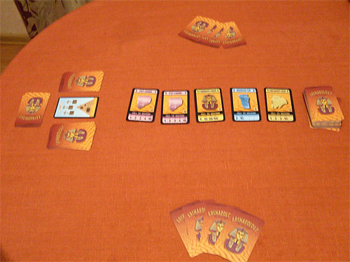 Одной темой, естественно, сыт не будешь — переходим к игровому процессу. В «А», несмотря на небольшое количество карт, процесс подготовки к игре достаточно сложен – сначала убираем из колоды специальные карты – воров, песчаные бури, карту пирамиды. Оставшиеся карты перемешиваем, раздаем каждому игроку по 4 карты, еще 5 карт идут в открытую, создавая на столе «Базар», еще 3+5+7 карт взакрытую кладутся рядом с картой «Пирамиды», формируя 3 стопки прикупа. Затем специальные карты (их количество варьируется в зависимости от количества игроков) возвращаются в оставшейся не розданной часть колоды и замешиваются. Можно начинать играть.