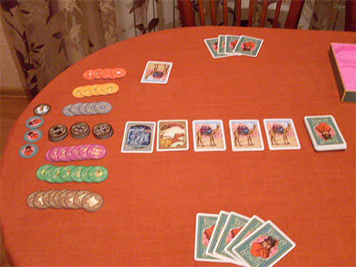 Подготовка к игре в «Д» тоже не блещет простотой. Сначала надо разобрать все жетоны победных очков: 38 жетонов товаров по 6 цветам в порядке возрастания – сверху получатся самые ценные, и 18 бонусных жетонов просто разделить на три группы. Затем из колоды карт достается три карты верблюдов, а оставшаяся часть колоды перемешивается. Каждому раздается в руку по 5 карт, затем достается еще 2 карты. Вместе с ранее выложенными тремя верблюдами они образуют «базар».