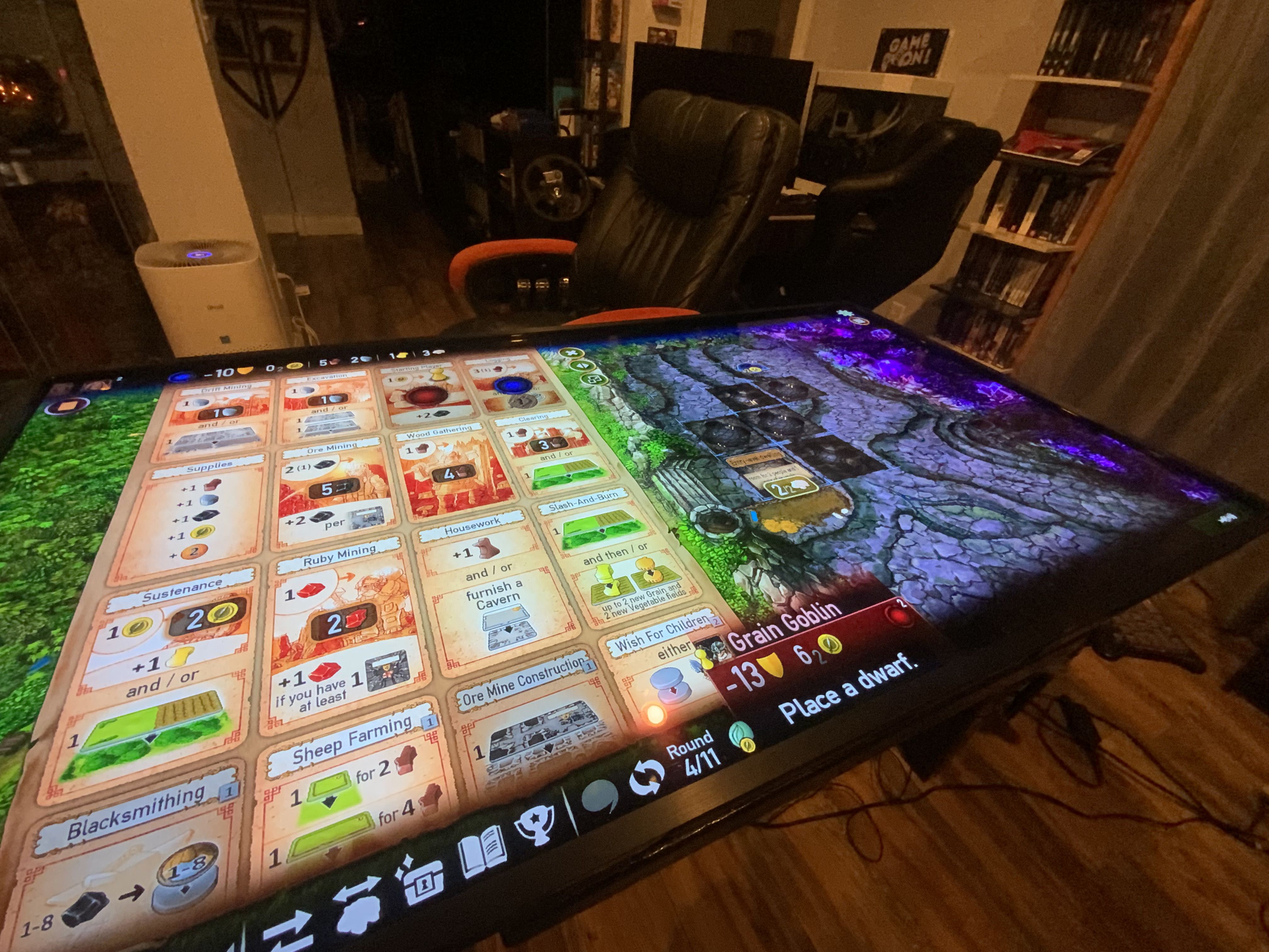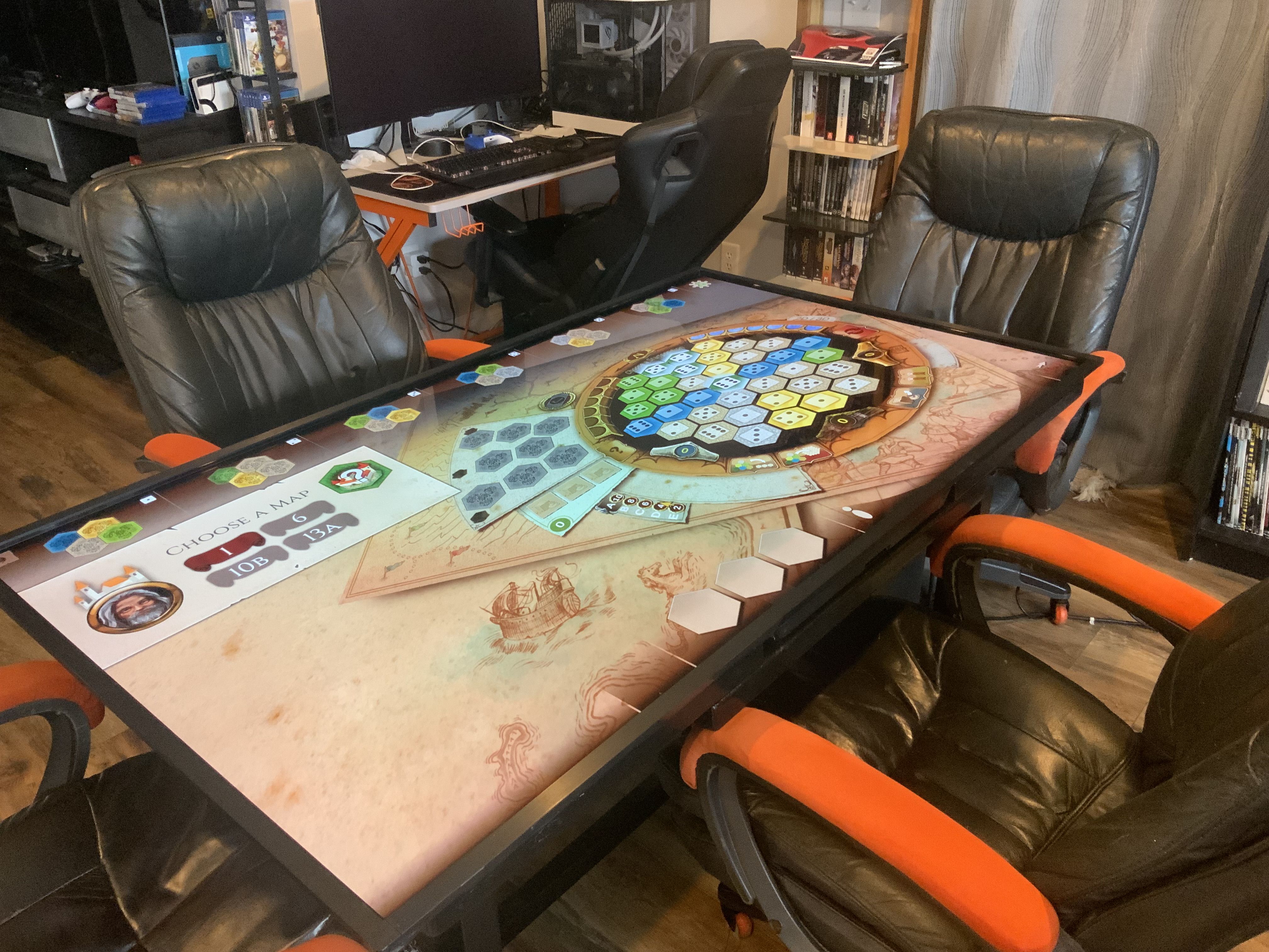 Большой плюс подобного стола — можно буквально моментально переключаться от игры к игре. Без вот этой уборки и расстановки. Закончил партию в одну настолку, закрыл приложение и тут же запустил другое. Автор отмечает, что основную массу настолок запускает через Steam, но в целом даже если чего-то нет в «Стиме», можно попробовать просто найти интернет-версию и запустить в браузере.