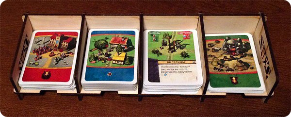 И, вот, наконец-то, мы с Галей выбрали время, чтобы протестировать новинку. В качестве подопытной игрушки выбрали Поселенцев. Там как раз есть по личной колоде на игрока, плюс одна общая колода. Это уже три ячейки. А четвёртая пусть будет под отбой.