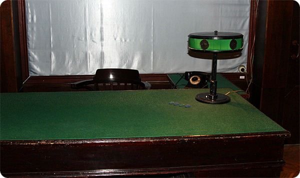 Рабочий стол Сталина в комнате отдыха. Обстановка спартанская: стул, приставная тумбочка, лампа, да телефон. Всё стоит с 1942 года, только около десяти лет назад заменили сукно. Под лампой — те самые танки 🙂