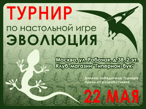 В это воскресение, 22 мая в Москве в книжном магазине Гиперион-Бук состоится турнир по Эволюции. Турнир стартует в 13.00. Участие в турнире бесплатное.