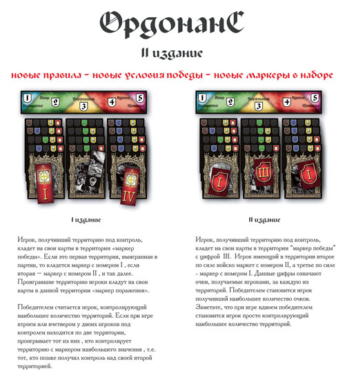 В прошлом месяце в продажу поступило обновлённое издание Ордонанса. Благодаря Ивану Туловскому один экземпляр попал ко мне в коллекцию. А теперь подоспела более полная информация об этом издании. Оно отличается от первой редакции новыми маркерами побед и изменёнными правилами подсчёта очков, а также одной новой картой.