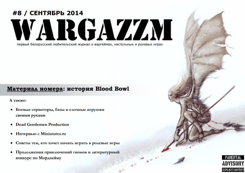 В сети появился новый, 8-й номер проекта Wargazzm, журнала о военных играх, настольных и ролевых играх и всём, что с ними связано. В номере — интервью с редактором сайта miniatures.ru, объемнейшая статья об игре Blood Bowl, настольном фентезийном американском футболе, а также всякие материалы по военным и ролевым играм и миниатюркам.