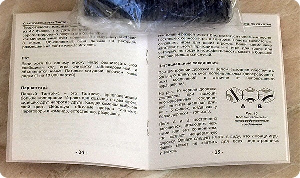 Тантрикс поставляется в удобном мешочке походного формата, внутри которого находится буклет правил, а также набор игровых фишек.