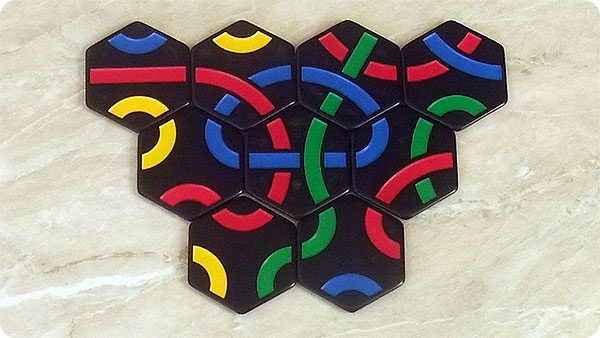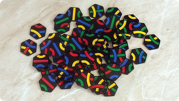 Сама игра — это набор вот таких шестиугольников с нанесёнными на них линиями четырёх цветов: жёлтыми, красными, зелёными и синими. Фишки выполнены из пластмассы, очень качественные, приятные на ощупь.