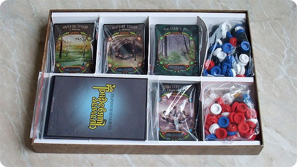 Непосредственно под правилами мы видим коробку, доверху набитую компонентами. Это, в основном, различные колоды карт, а также пластиковые фишки.