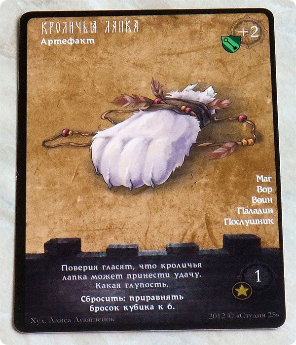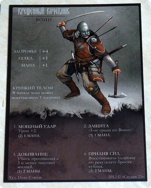 На этих картах обозначены параметры и способности бойцов. Сюда же в процессе игры выкладываются фишки, обозначающие запас здоровья и магической энергии героев. По мне карточки можно было бы немного осветлить, а шрифты сделать побольше, а то при неидеальном освещении не всегда можно с первого раза разобрать что написано на карте.