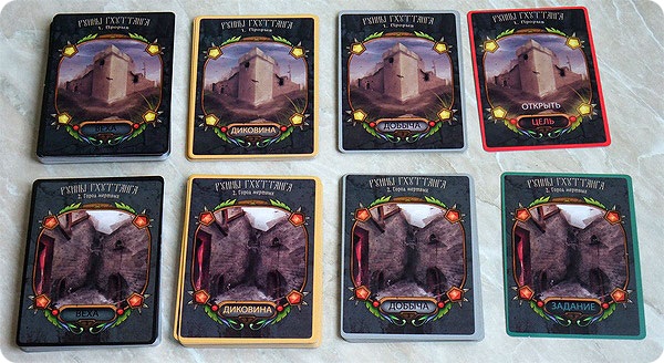 На рубашках карт указано к какому квесту и типу она относится. Глядя на оформление рубашек вспоминается совет: "Чем больше разных шрифтов используется, тем выше уровень дизайнера" 🙂