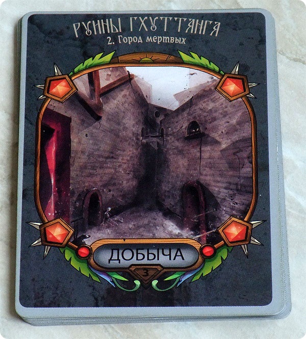 Собственно, сама игра состоит из карт. Они бывают нескольких типов и заранее рассортированы по 6 стопкам. Каждая стопка, это отдельный квест, отдельное приключение, почти отдельная игра. Внутри квеста карты бывают нескольких типов: локации (вехи), обычные и уникальные предметы (добыча и диковина), а также карты заданий.