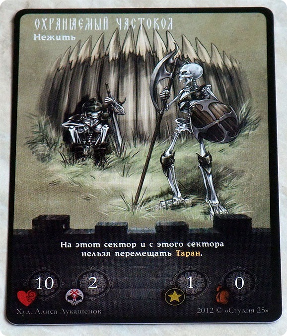 Сами карты устроены по следующей схеме: в верхней части имеется изображение. В нижней — условные обозначения и параметры. Ключевые игровые термины выделены цветом и написаны с заглавной буквы.