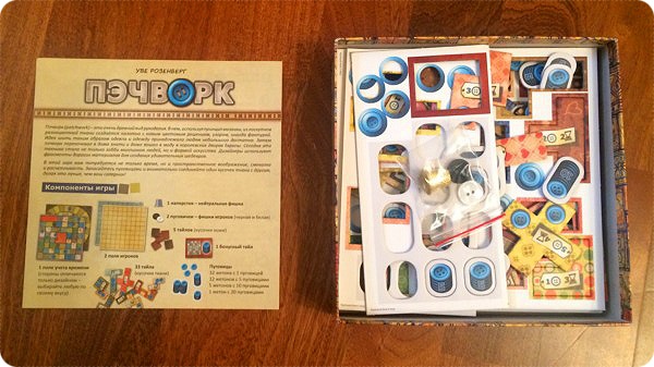 Мы пока ещё не успели освоить Пэчворк, я только-только получив игру, я сразу же полез смотреть, а что там у неё внутри. До этого, конечно, видел обзоры и даже мельком смотрел как её раскладывают у нас на игротеке, так что примерно представлял: там есть какое-то поле, тетрисо-образные фигуры и пуговицы. Но в подробностях с компонентами знаком не был.