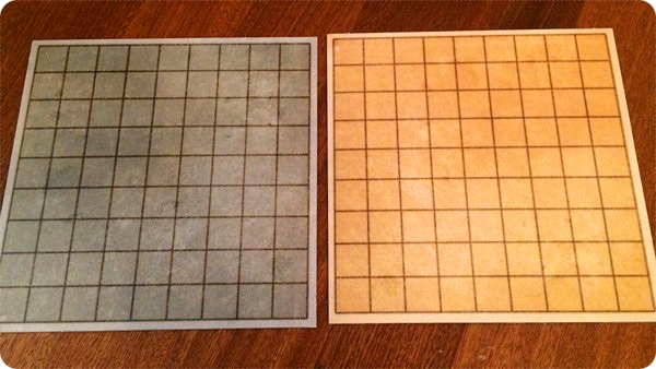 Вытаскиваю всё из коробки и на дне обнаруживаю три картонных поля. Два из них одинаковые, пустые, разлинованные на клетки размером 9х9. Поля отличаются только фоном.