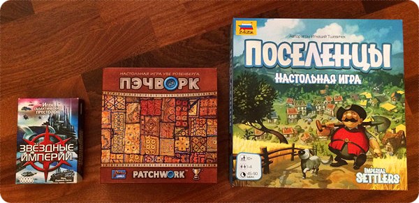 Сама коробка, кстати, не очень большая. Вот для понимания размеров фото рядом с маленькой коробочкой Звёздных империй и стандартной большой квадратной коробкой Поселенцев.