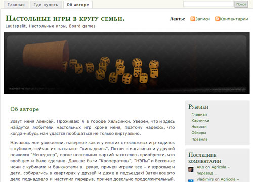 На просторах интернета появился сайт любителя настолок из Финляндии. Называется он Настольные игры в кругу семьи и располагается по адресу: http://nastolker.wordpress.com. Автора этого проекта зовут Алексей, и вот как он сам отрекомендовывается: