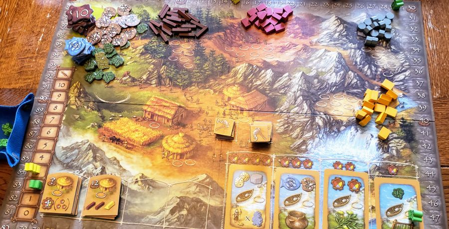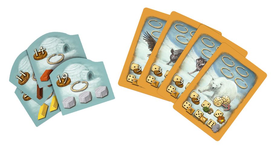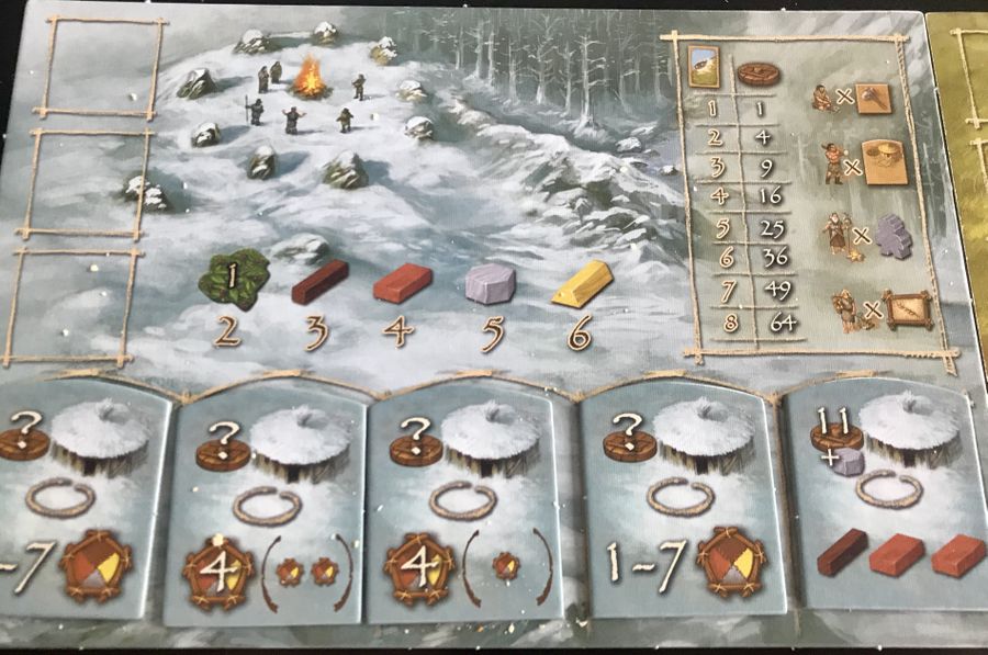 Что особенно приятно, изменение оформления коснулось абсолютно всех компонентов. Помимо поля это личные планшеты игроков, где тоже отчётливо просматривается тема зимы. Первобытные люди сгрудились у костра, закутанные в тёплую одежду.