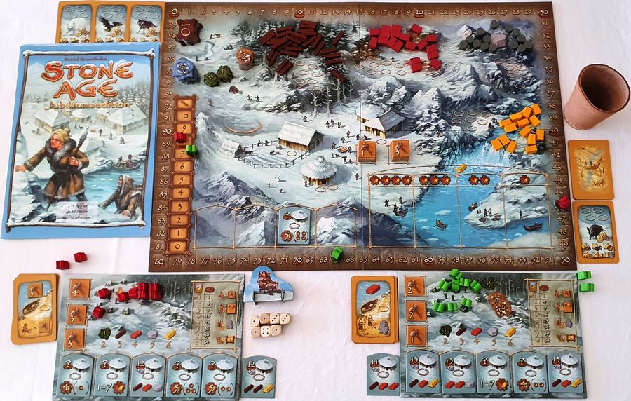 По следам недавней заметки про зимний вариант «Каркассона» вспомнилась ещё одна настольная игрушка, где также есть специальный «сезонный» вариант оформления. Это известная (возможно, уже в прошлом) семейная игрушка Stone Age, издававшаяся в России под названиями «100 тысяч лет до нашей эры» и «Каменный век». Оригинальная её версия была обычной, с «летним оформлением», но позднее выходило юбилейное 10-летнее издание, где был альтернативный вариант иллюстраций на тему зимы.