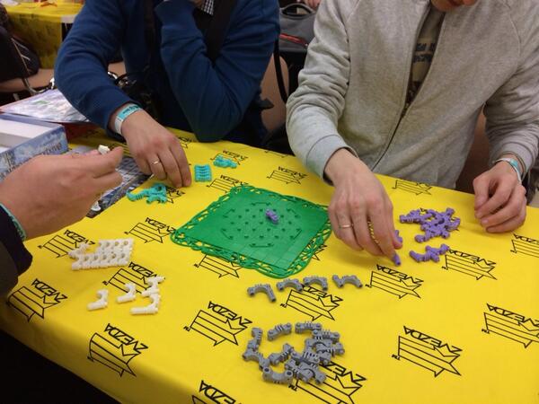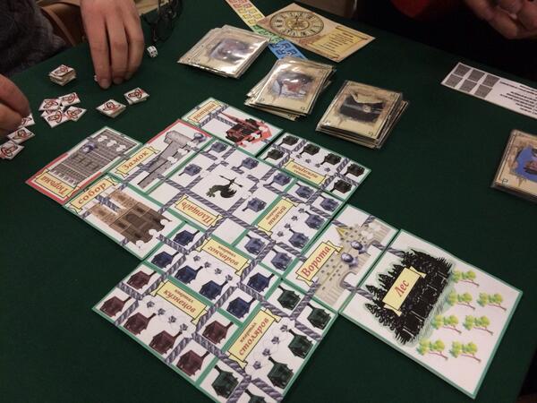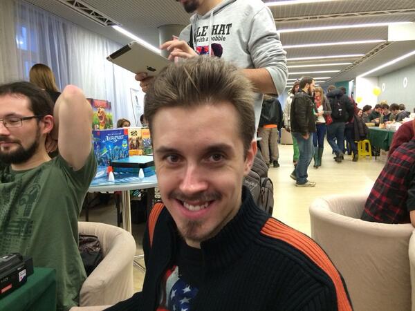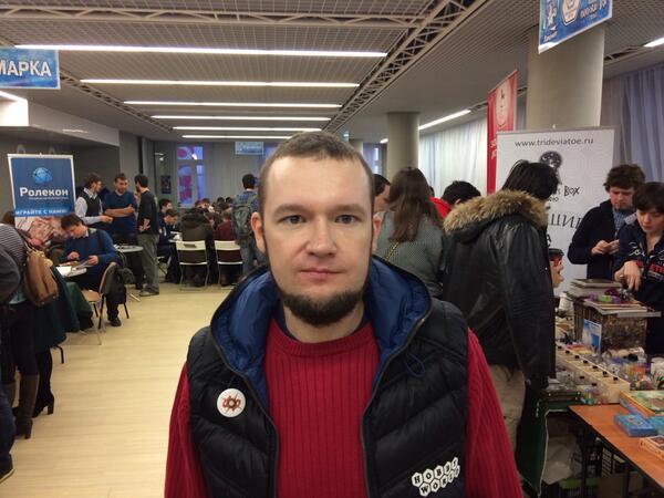 Начальная программа у меня всегда одна и та же — обход всего фестиваля с целью осмотреться и поздороваться со знакомыми. Не стал исключением и зимний Игрокон. Практически сразу же на втором этаже стали попадаться знакомые лица: Мария Веселкова и Алексей Кабанов (представители Мира Хобби), Денис Настолкин, Максим Верещагин и Дмитрий Павлов (менеджеры Звезды), чуть позже увидел Ивана Попова и Михаила Акулова (руководители Мира Хобби). Тут же нашлись и наши, самарские ребята из клуба настольных игр Треугольный Еж — Михаил Парийчук и Максим Гнеушев.