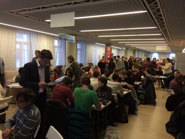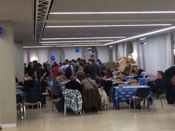 Из небольшого фойе любители настолок и просто интересующиеся попадают на лестничную площадку, где ступеньки пестрят мотивирующими наклейками с надписями типа "До Игрокона совсем чуть-чуть!" и "Вперёд к настолкам!". Тут же вперемешку идут небольшие наклейки в виде следов от ботинок с надписью "Игрокон". По ним я и попал на фестиваль. Зашел на второй этаж и отправился в гардероб. Свободных номерков уже не было, куртку просто взяли и положили сверху вешалки, так как все уже было забито вещами посетителей. Потом посмотрел по сторонам, и сразу стало понятно, что забитый гардероб — это только начало. Все помещение, отведенное под игротеки, оказалось целиком заполнено людьми. Ни одного свободного стола. Толпы людей повсюду. Вот мое первое впечатление от зимнего Игрокона-2014.