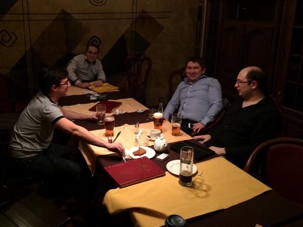 За одним столом собрались самые стойкие: Михаил Акулов, Александр Булгаков, Максим Трофименко, Иван Туловский, Максим Верещагин, Дмитрий Павлов, Денис Настолкин, Алексей Юшин, Юрий Ямщиков, а также еще несколько человек, среди которых была ранее незнакомая мне семейная пара. Каково же было мое удивление, когда оказалось, что эти люди меня заочно знают и у нас с ними есть общий знакомый в Польше — Дмитрий Шугаев, благодаря которому в прошлом году я разжился такими замечательными играми как Робинзон Крузо и City of Horror. В этой теплой компании мы провели примерно пару часов, обсудили немало животрепещущих вопросов, узнали кое-какие слухи и закулисные факты об околонастольной жизни, посмеялись над новомодными тенденциями и обменялись мнениями о различных настольных событиях. А потом наступило 11 вечера, и пришла пора покинуть этих прекрасных людей, потому что еще нужно было и написать отчет, и поспать перед вторым днем.